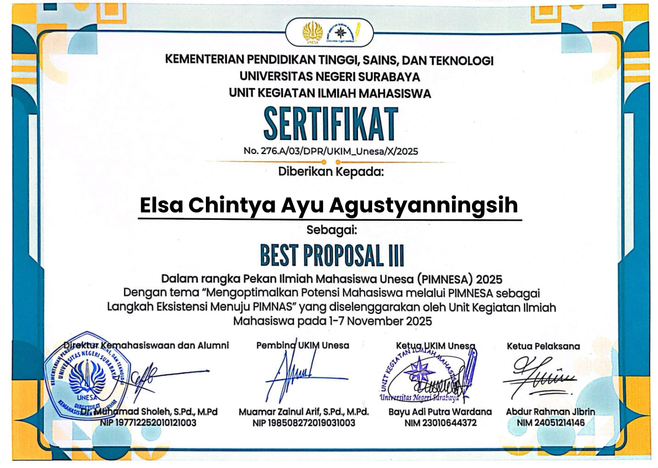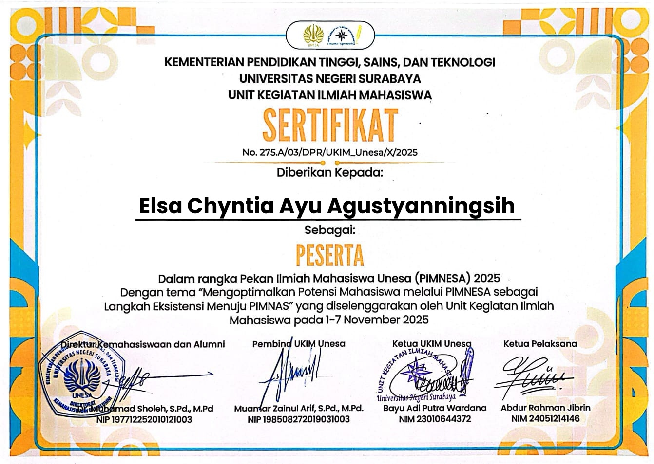 Saya adalah mahasiswa aktif S1 Pendidikan Teknologi Informasi di Universitas Negeri Surabaya yang memiliki semangat tinggi untuk belajar dan berkembang serta memiliki minat di bidang teknologi informasi, pemrograman web, dan juga pendidikan.